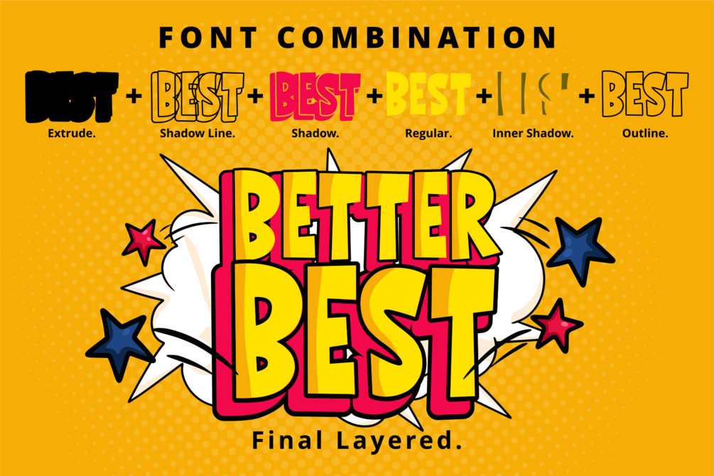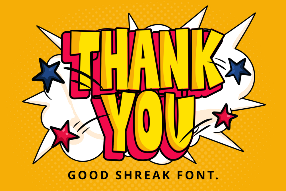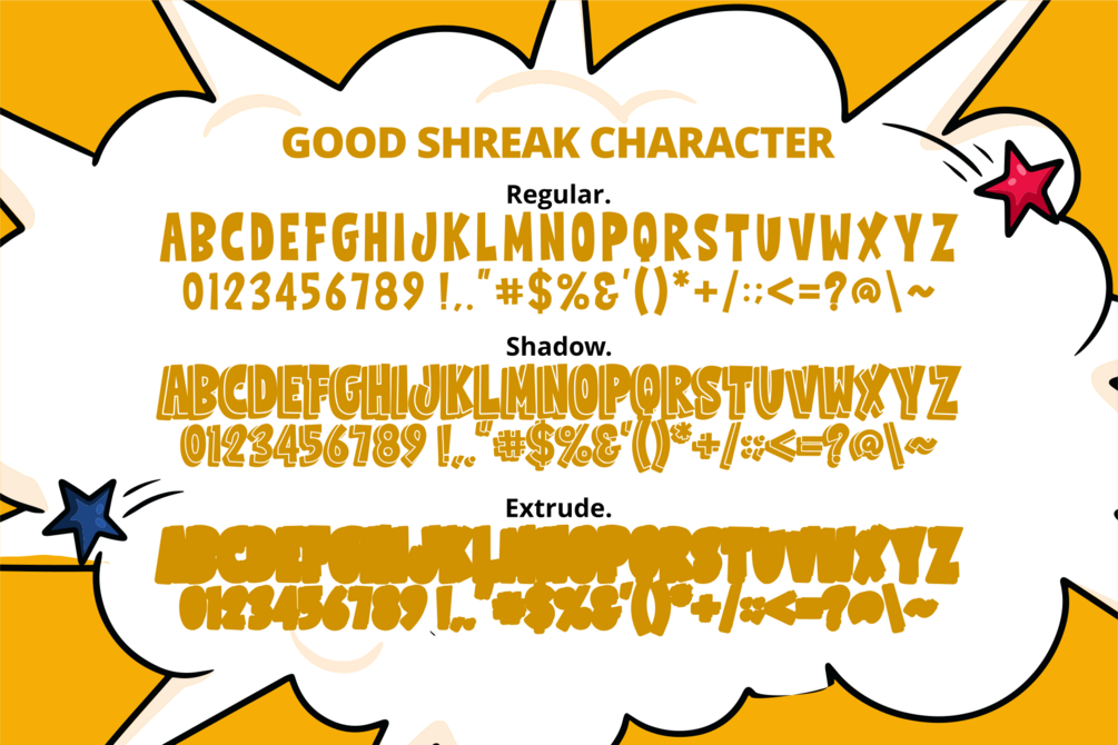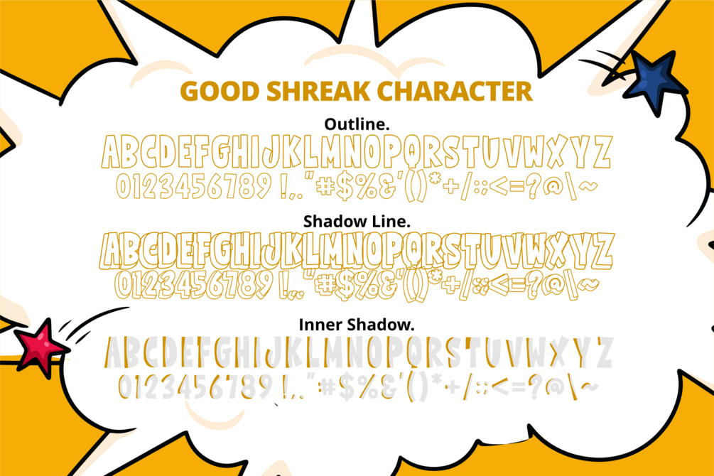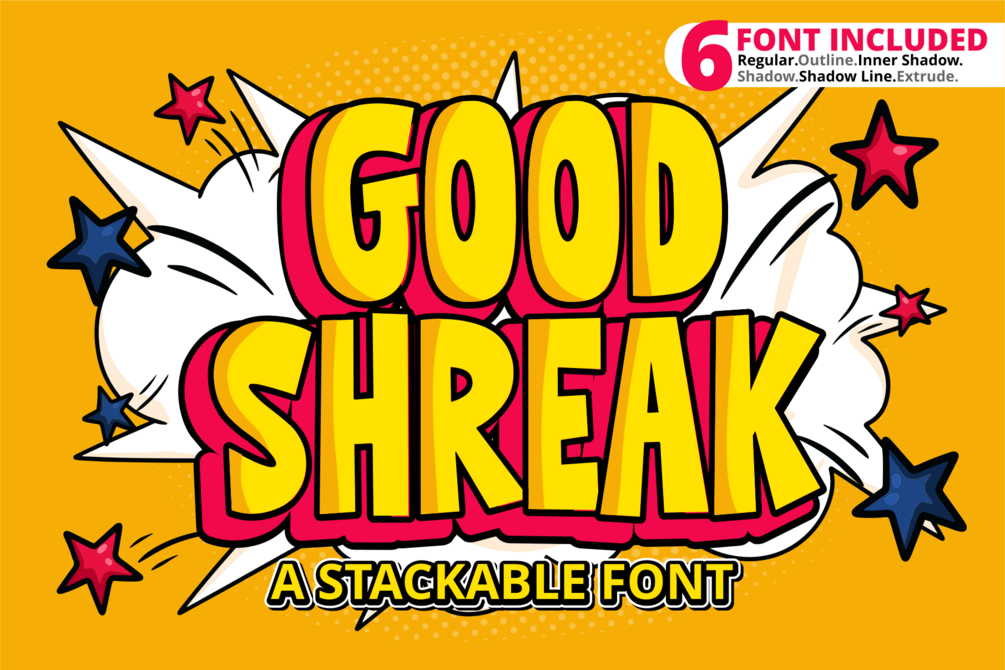 Good Shreak is a cool and friendly display font. six font included (Regular.Outline.Inner Shadow.Shadow.Shadow Line.Extrude.) Whether you are using it for cartoon-related designs, children’s games, quotes, titles, brand names, book covers, posters, or just any creation that requires a touch of joy, this font is a great choice.